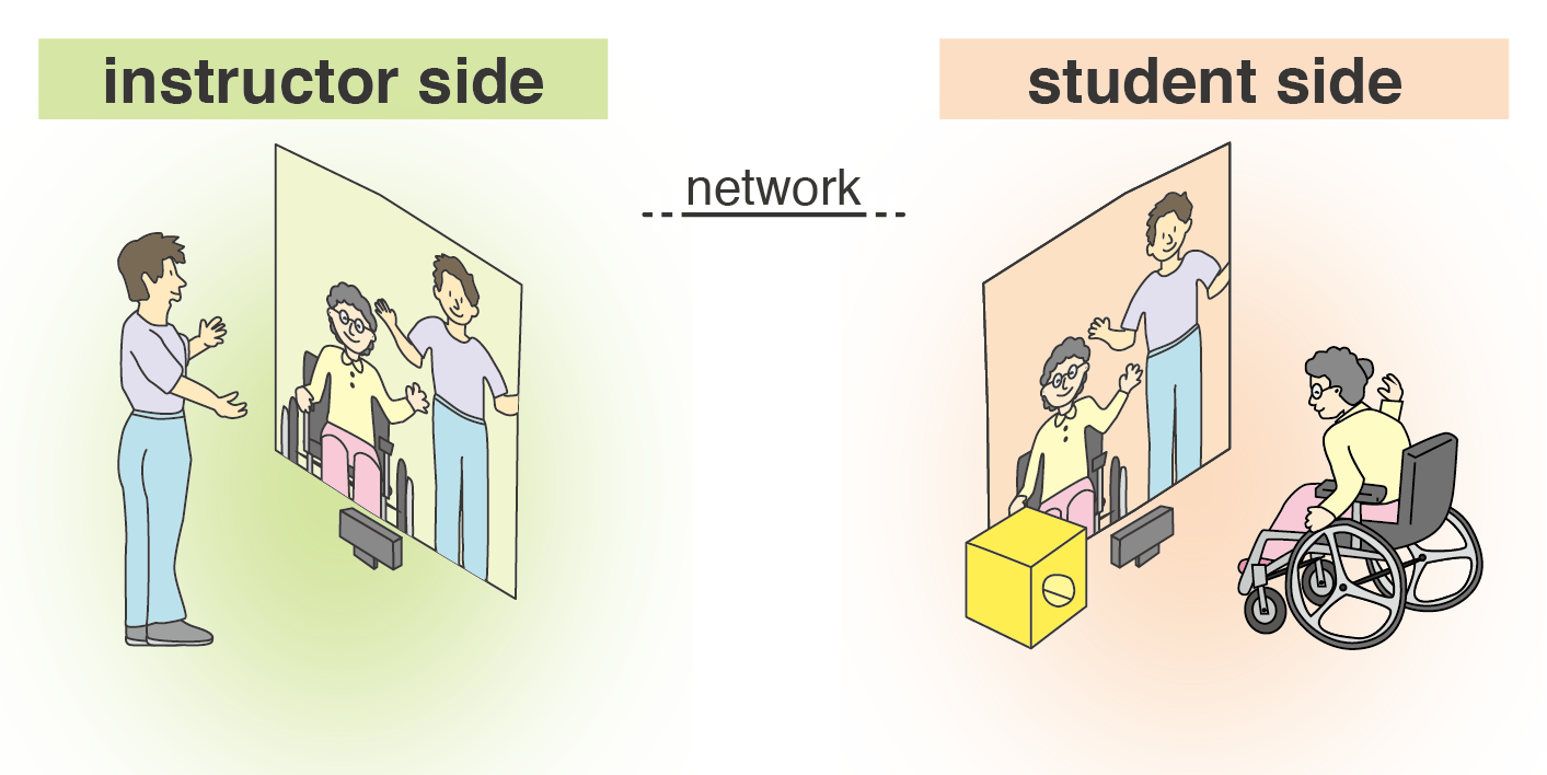 Remote exercise systems can be a solution for this problem because they may be able to support exercise activities even when instructors and participants are in separate locations. However, when simply using normal video-conferencing systems, instructors and participants have difficulty understanding each side’s situation, particularly during guided physical actions. In addition, remote exercise systems cannot support the adjustment of the position of each user, a task that is quite naturally performed in normal exercise activities.
