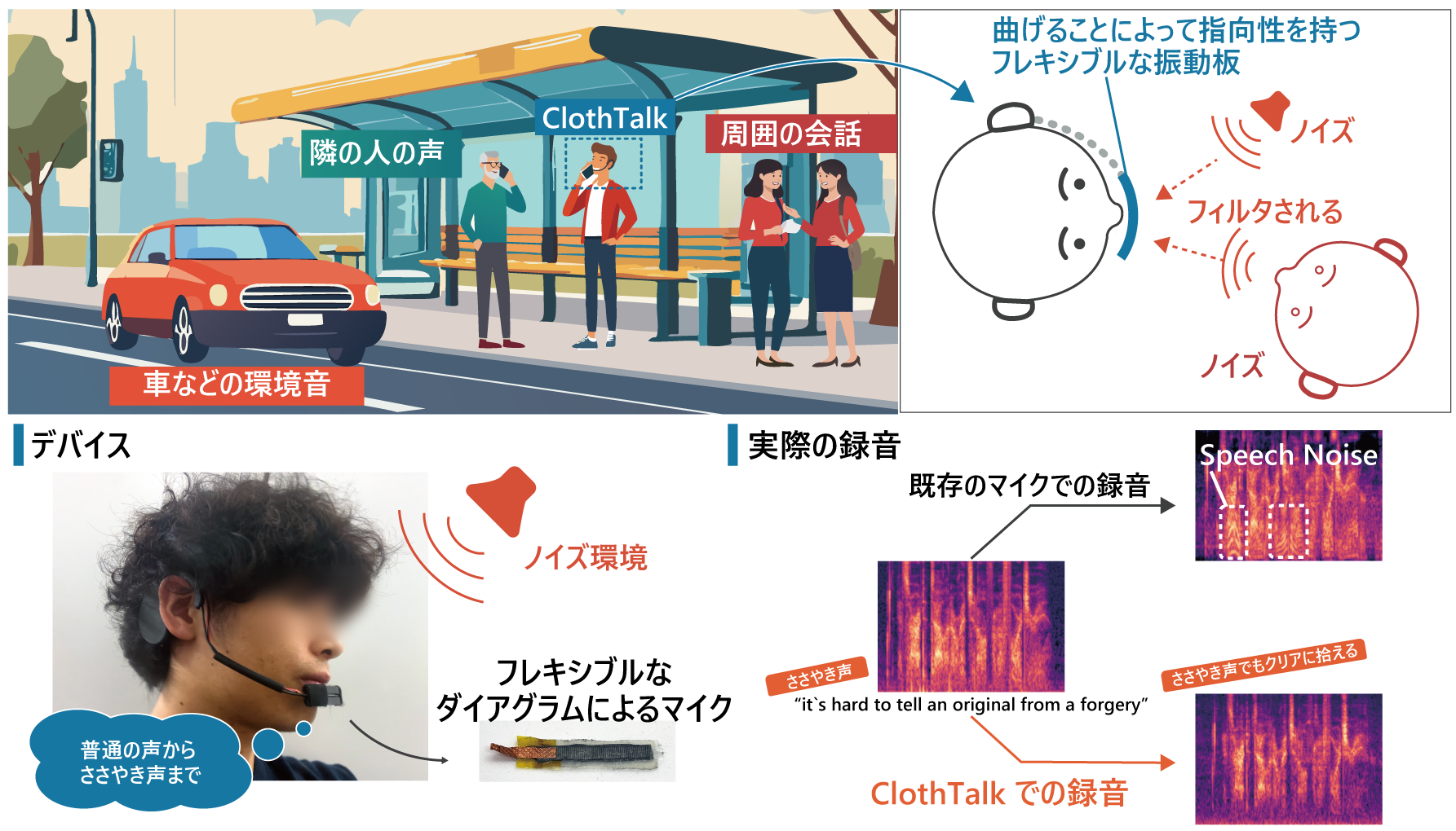 ClothTalkは、導電布によるフレキシブルなダイヤフラムのマイクを曲げることによって指向性を高め、装着者の発話を支配的に入力するとともに、周囲の全方位からのノイズを低減を可能にする。