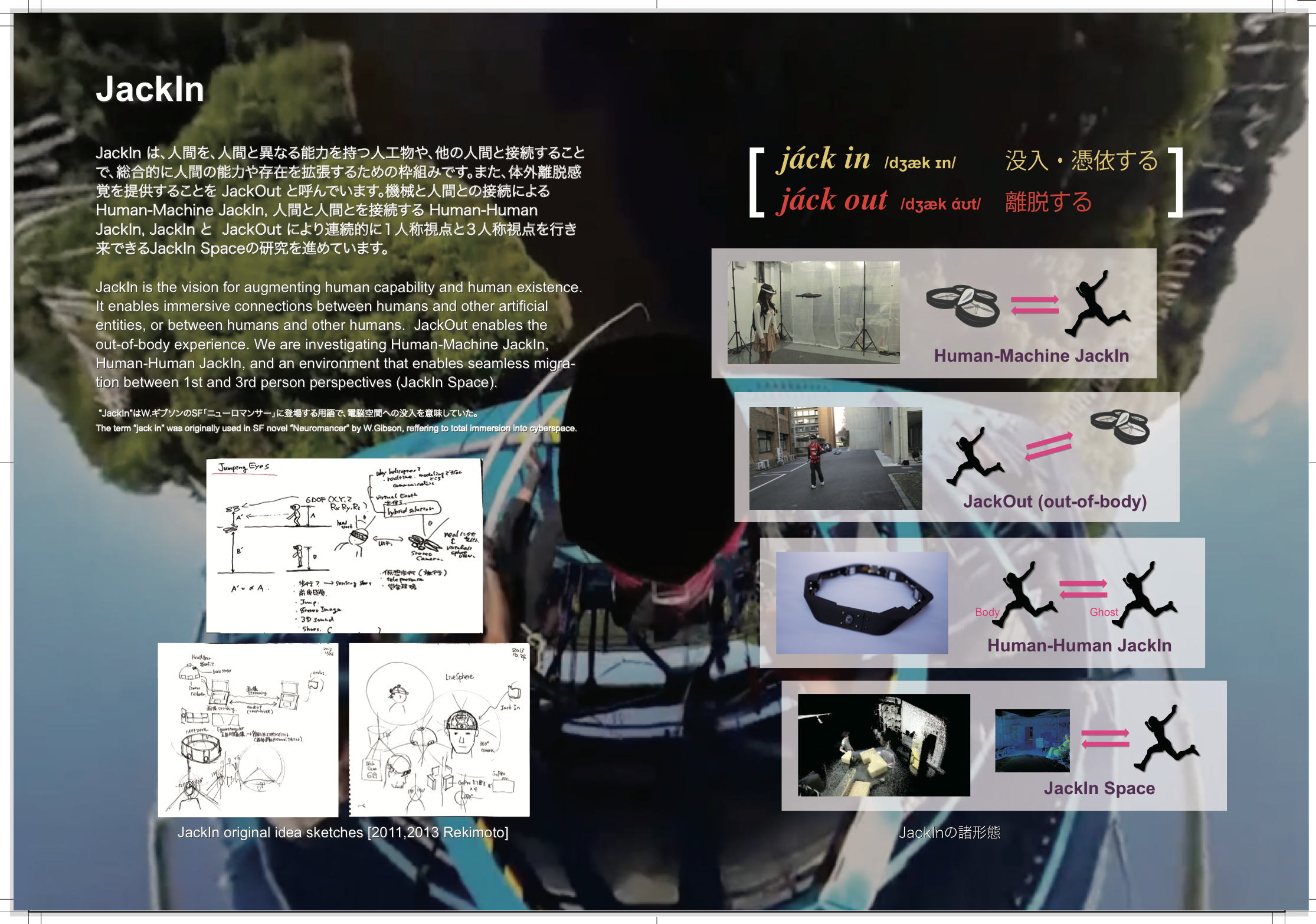 JackIn は、人間を、人間と異なる能力を持つ人工物や、他の人間と接続することで、総合的に人間の能力や存在を拡張するための枠組みです。また、体外離脱感覚を提供することを JackOut と呼んでいます。機械と人間との接続による Human-Machine JackIn, 人間と人間とを接続する Human-Human JackIn, JackIn と JackOut により連続的に1人称視点と3人称視点を行き来できるJackIn Spaceの研究を進めています。