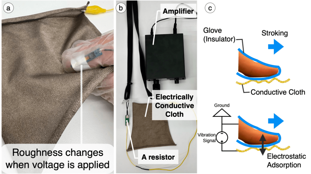 (a) Overview of the display concept: tactile sensation is modulated by manipulating electrostatic adsorption between the conductive fabric and the user’s finger, enabling texture variations (primarily perceived roughness) during fabric exploration gestures. (b) System configuration for end-to-end vibration transmission: the input vibration signal is amplified and applied to the conductive cloth, enabling presentation of vibration signals recorded from fabric. (c) Principle of the Pinching Tactile Display: the applied high voltage attracts and controls small electric currents flowing within the finger, so that users perceive the fabric’s tactile sensation as if it has changed.