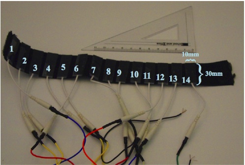| 1枚のベルトには14個、装置全体では28個の電極パッドが設置されています。刺激に使用する電極パッドの位置と電気刺激の大きさによって前腕の筋肉を局所的に刺激します。 |
