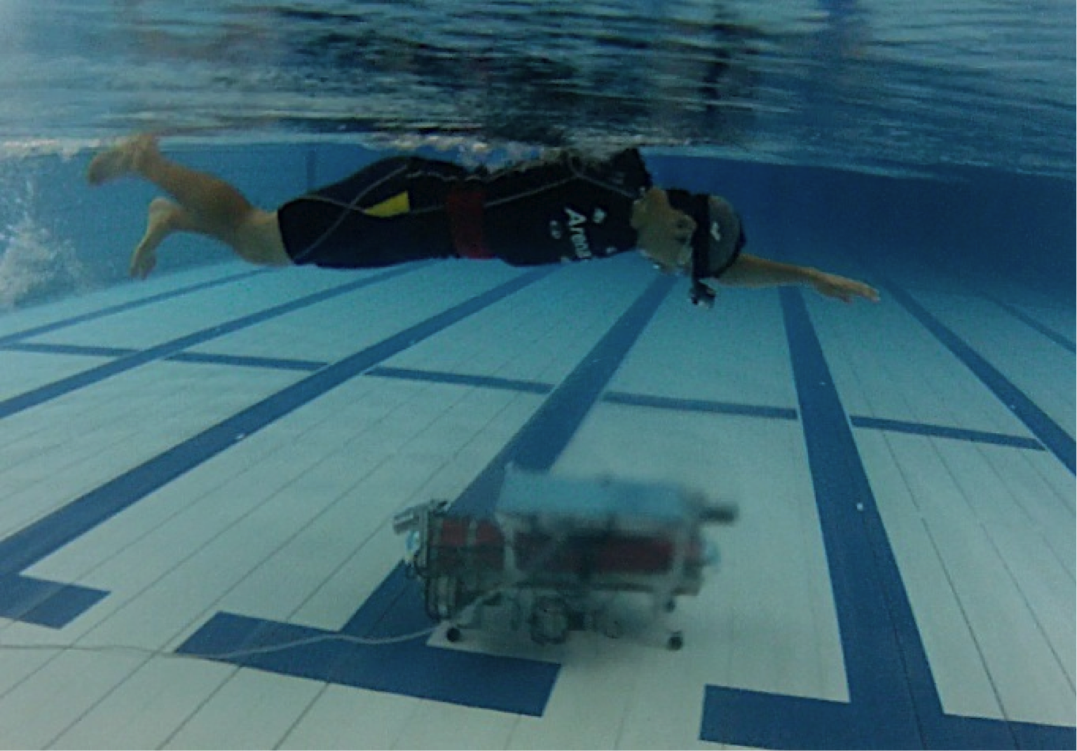 Swimoid is a swim support system using an underwater robot that can follow a swimmer and present information to a user by the use of a display.